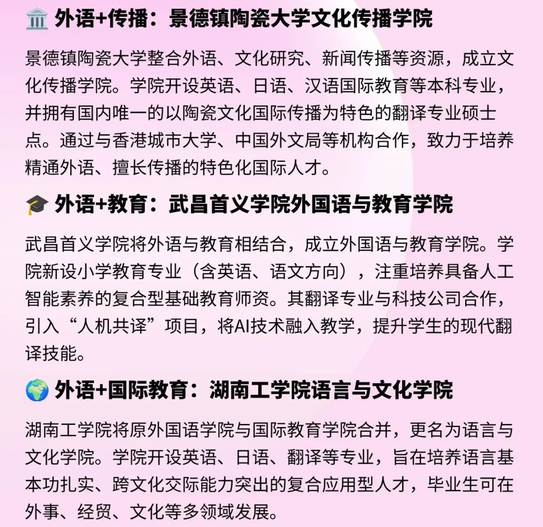 从景德镇陶瓷大学组建文化传播学院,到武昌首义学院、湖南工学院等院校的专业更名与方向重塑,一场围绕 “外语 +” 的学科变革正深度推进,为外语教育注入全新活力。